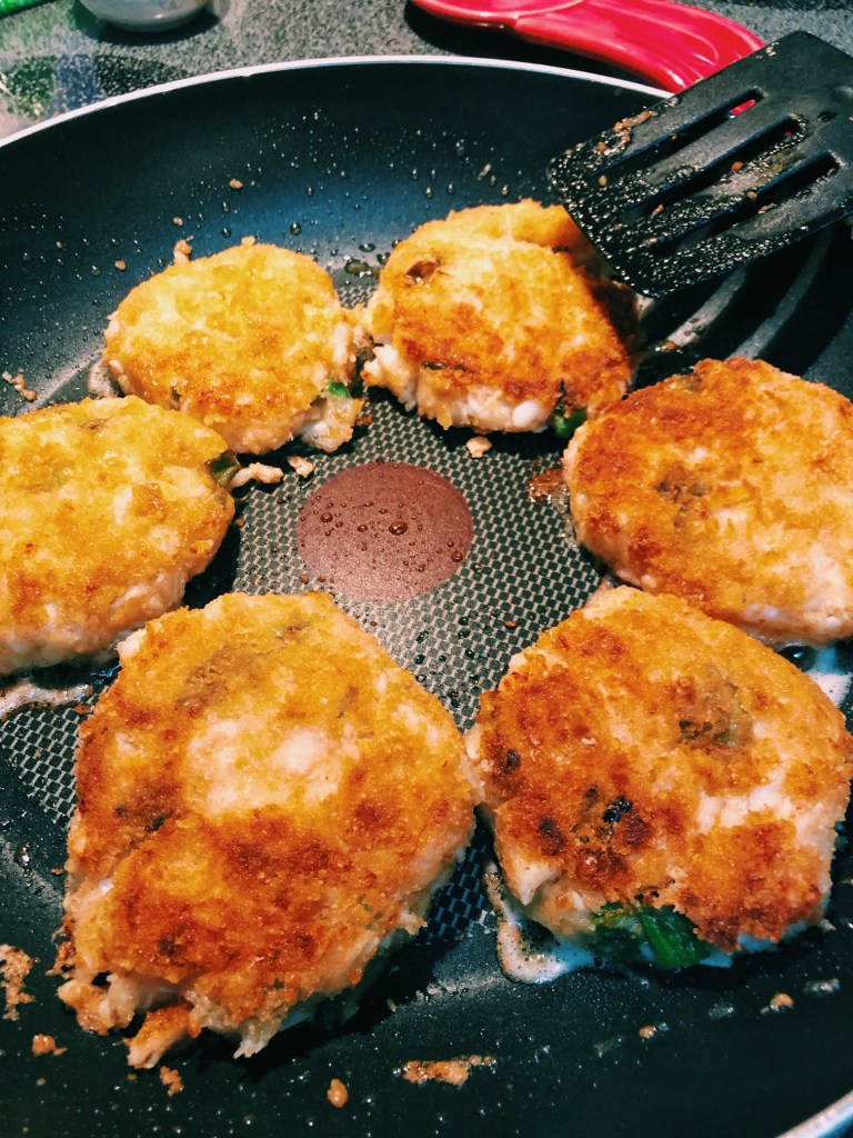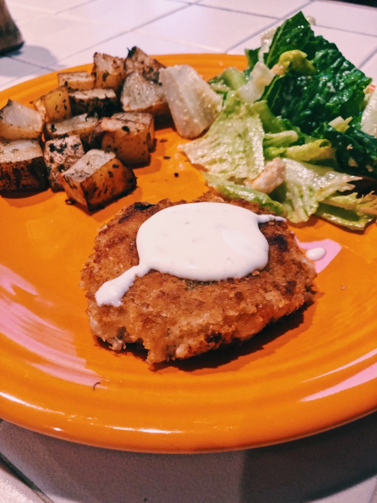 *Form crab cakes on wax/parchment paper. This way when you coat them with cracker crumbs, you don’t make a mess everywhere.