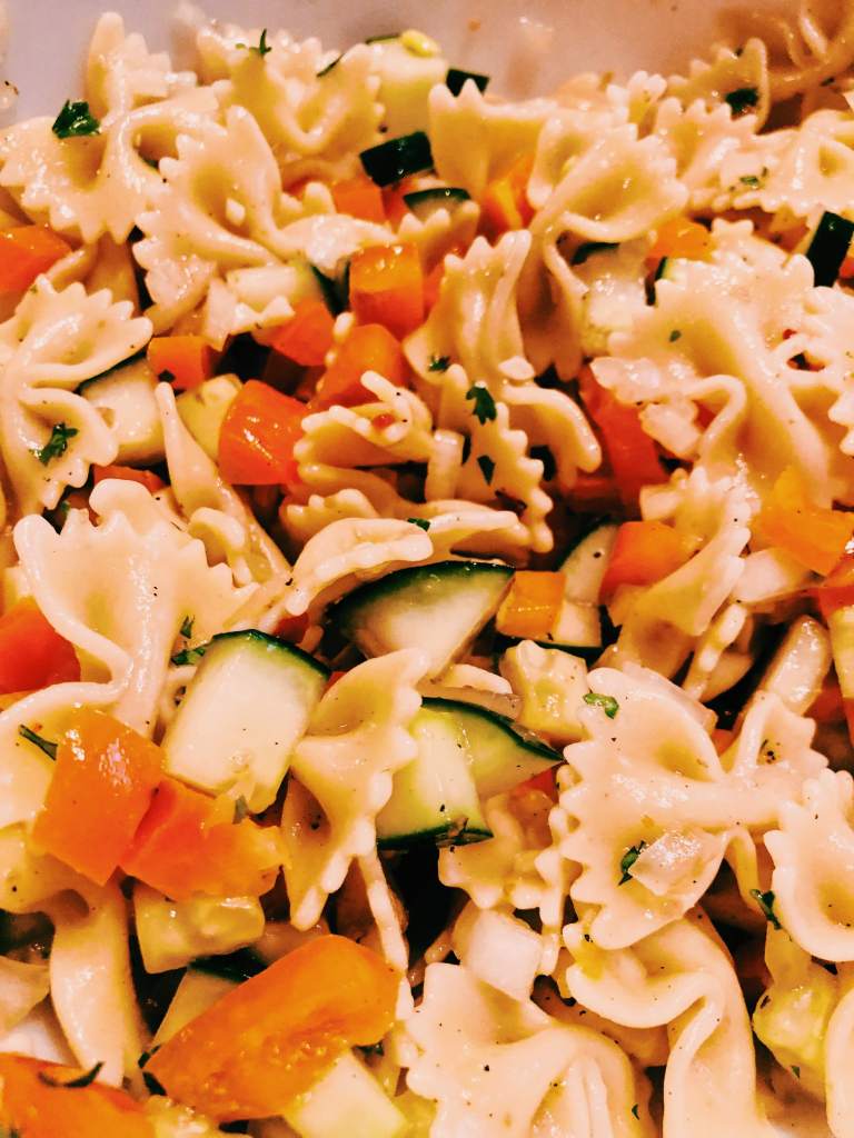 *TIP* – If you make it last minute (or even if you don’t want to wait for the noodles to cool to room temp) stick a bunch of ice cubes in the strainer with the pasta. Mix the ice/pasta around with a spoon until the noodles are cool. Then remove ice before mixing in veggies.