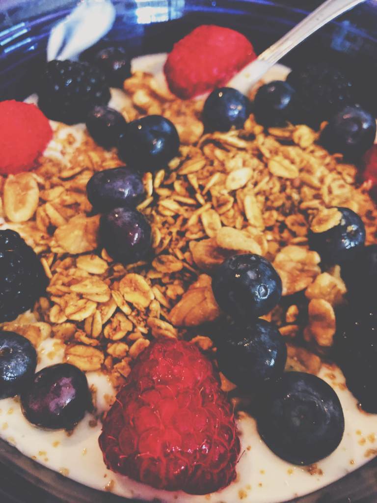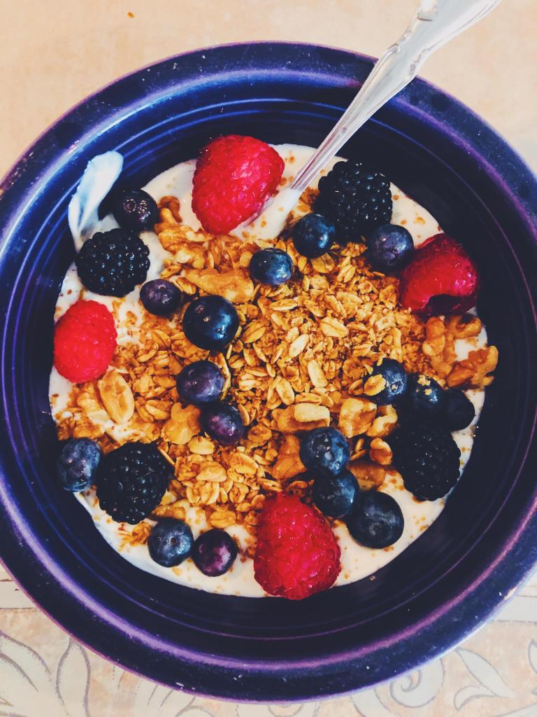 Granola is a tricky one because it usually contains a lot of sugar. I like to believe it is filled with healthy grains though, making it a healthier start to the day than pastries or waffles or pancakes. I’ve been using maple pecan granola or vanilla almond granola, but any kind will work. The important thing for me is that it tastes good but also that it doesn’t have super high sugar levels, so I try to find that balance.