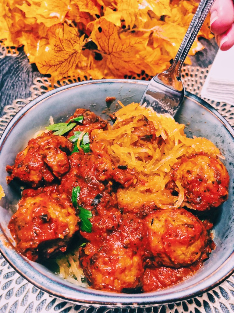 I love this recipe because it is a little something ~new and different~ from the traditional spaghetti and meatballs. Spaghetti squash is just as delicious (but perhaps a little less filling). This recipe has a great nutritional value and lots of flavor.